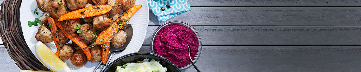Kycklingköttbullar med krämig isbergssallad och vinägerstekta morötter