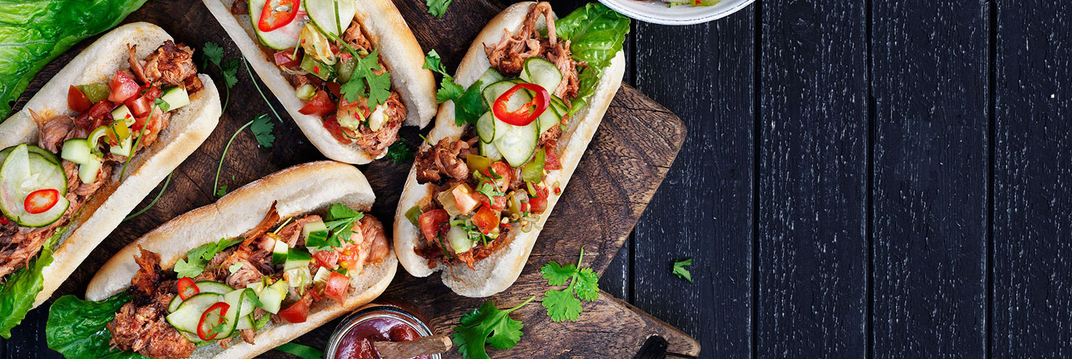 Pulled pork i bröd med snabbpicklad chiligurka och tomatsalsa